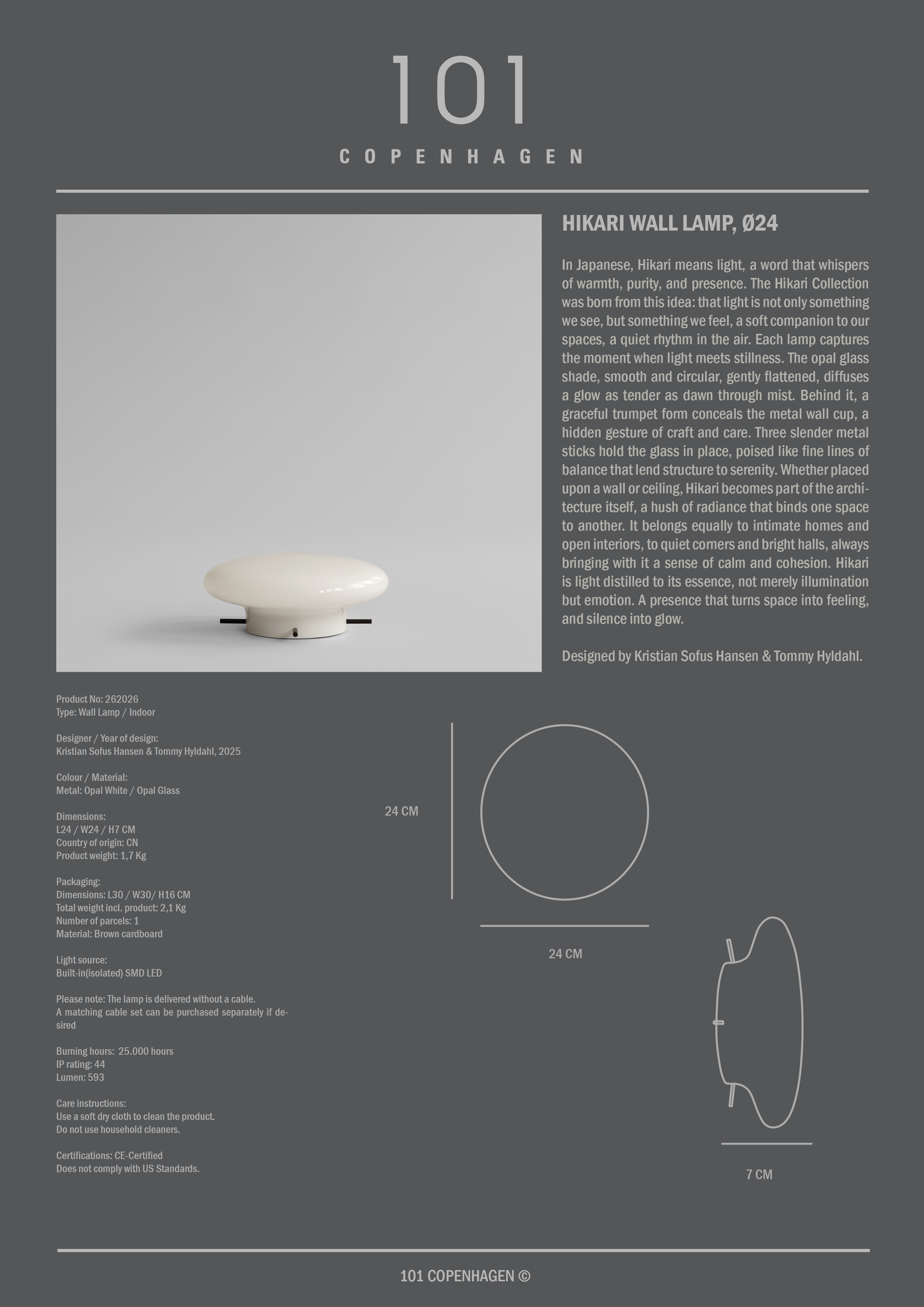 101 Copenhagen Hikari Wall Lamp Ø24 Opal White 275 € Live price match Ready for delivery in 30–40 days Add to basketExplore more product information Free shipping on orders above 150 € Excluding large furniture and other selected products 365 days return rights Authorised distributor