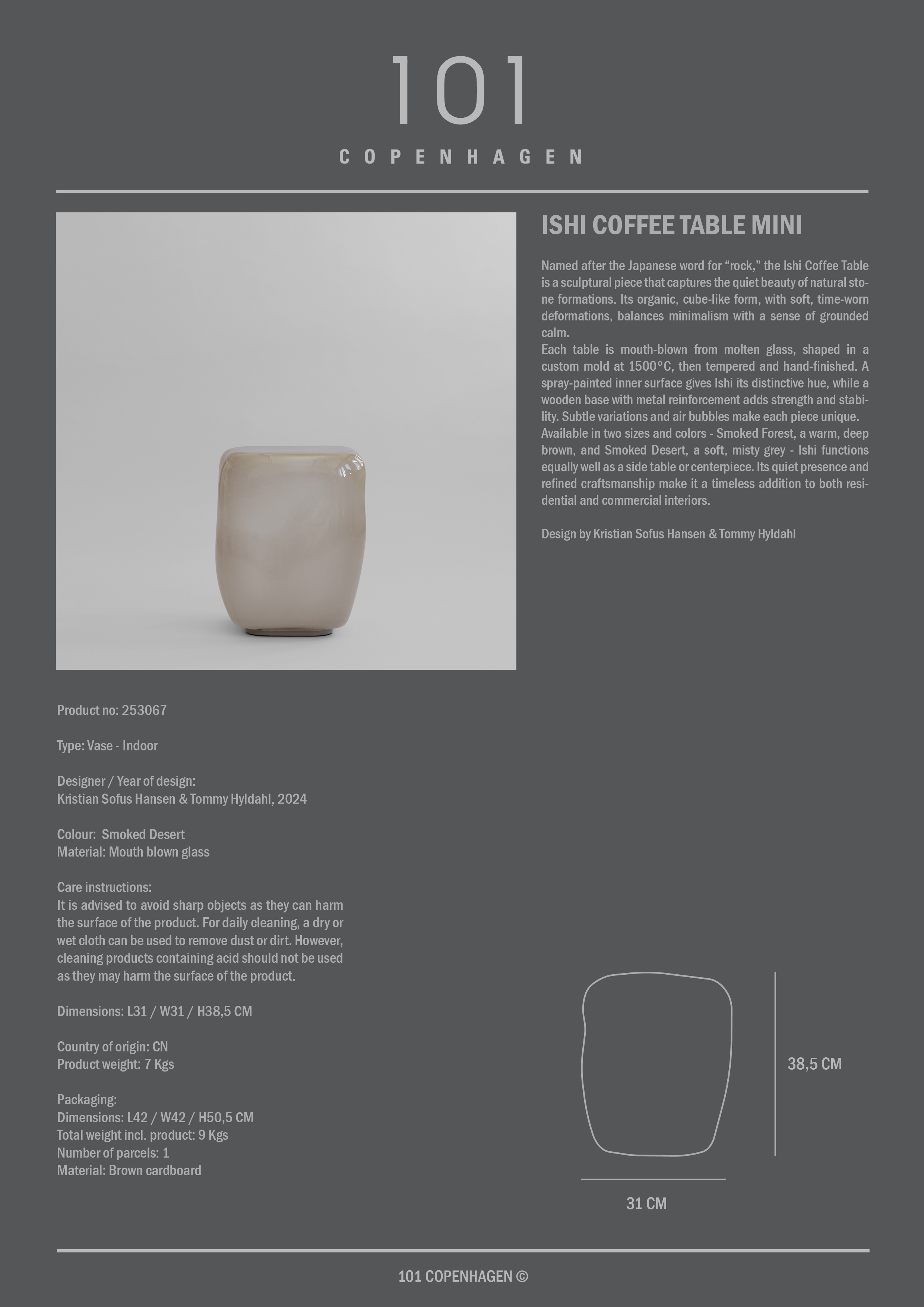 Ishi Coffee Table means stone in Japanese and is a sculptural table inspired by natural rock formations. The cubic, organic shape with soft deformations combines minimalism with tranquility. The table is mouth-blown glass, shaped in a special mold at 1500°C, tempered and hand-finished with a spray-painted interior and wooden base with metal reinforcement. Small variations and air bubbles make each table unique. Available in two sizes and colors Smoked Forest, a warm deep brown, and Smoked Desert, a soft gray. Ishi functions as a side table or centerpiece and adds stylish craftsmanship to both private and public spaces. Designed by Kristian Sofus Hansen and Tommy Hyldahl.
