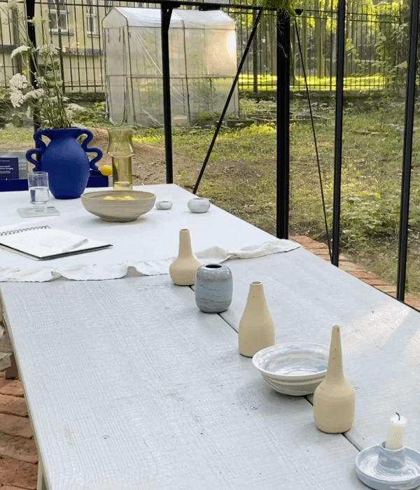 I really enjoyed matching different shapes in the products I have selected. While the place I've styled is my dreamed greenhouse I wished to show how incredibly sunlight works there. That's why I've chosen a lot of colorful glass. The two cushions are a real mix of "why so serious" and a raw expression.